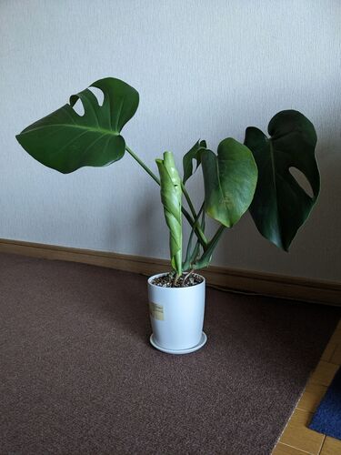 一番小さいモンステラから、新しい葉っぱが出てきた 6月29日撮影